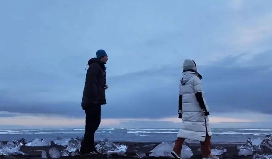 从两人穿搭来看,这场求婚还是比较随性,孙丞潇黑色羽绒服搭蓝色帽子,金莎银色羽绒服、灰色帽子搭红裤子,也算是“红蓝CP色”了。而他们选择的求婚地点也有美好的寓意,“钻石沙滩”象征爱情像钻石和冰川一样永恒。