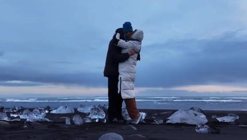 画面中,两人身处冰岛的沙滩上,路边有很多透明的大冰块,孙丞潇单膝跪地拿着戒指面向对面的金莎,随后金莎向他靠近,两人踮脚拥抱亲吻,浪漫唯美。