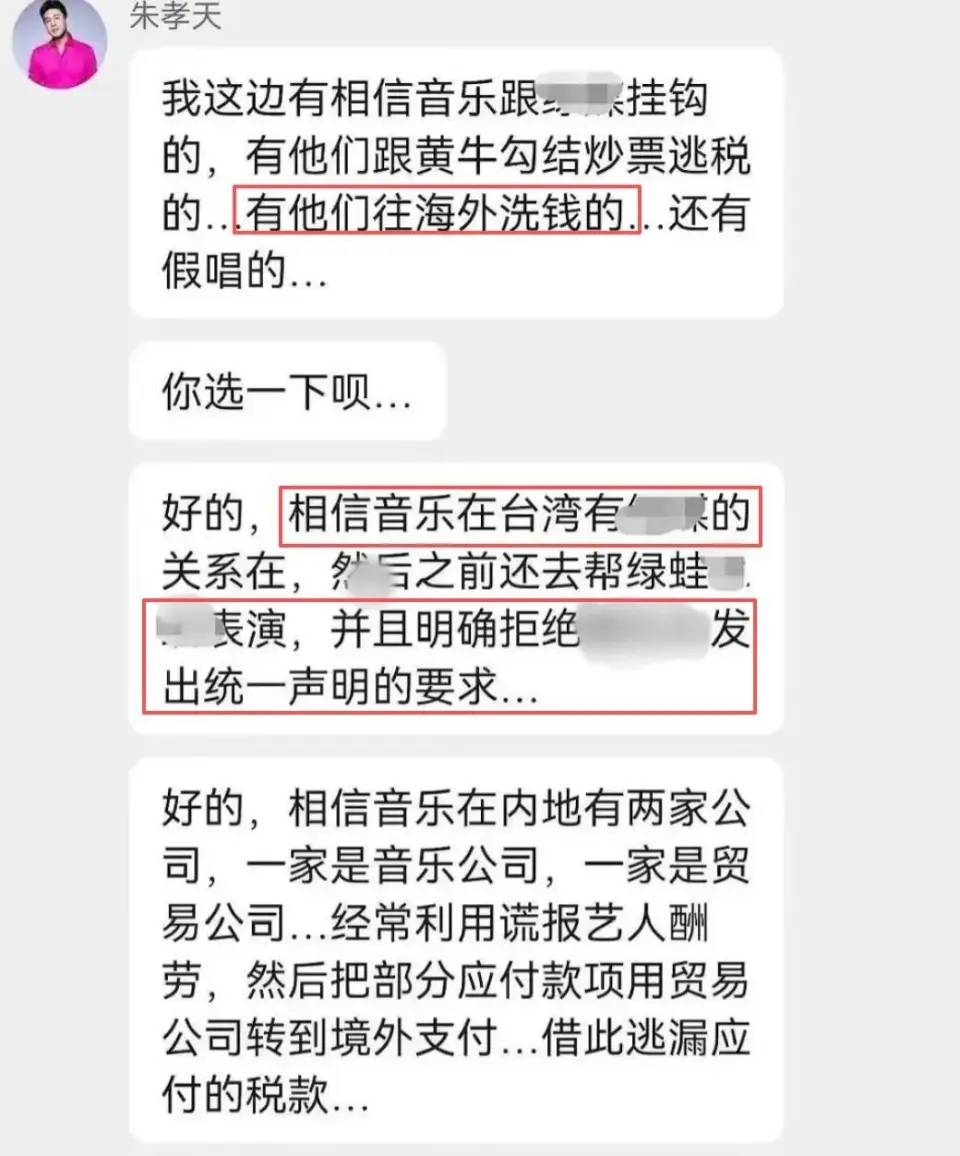 朱孝天跟相信音乐的风波越演越烈,他本人出面控诉相信音乐让艺人假唱,还勾结黄牛炒高票价逃税,向海外洗钱,跟某势力关系密切,可以说桩桩件件都是十分严重的指控。