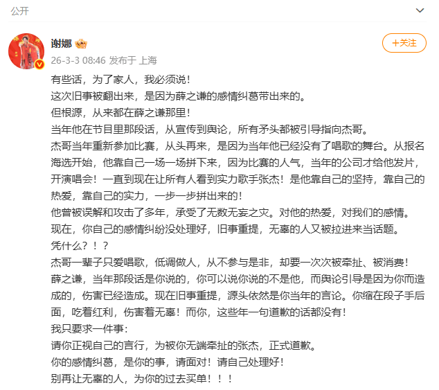 3月3日,谢娜发布长文,正面喊话薛之谦,要求对方就早年争议言论给张杰造成的长期伤害正式道歉。事件导火索为3月2日薛之谦相关情感纠纷爆料中,提及对张杰的不当评价,引发旧议重提。谢娜在文中指出,薛之谦早年在节目中的言论虽未点名,但经舆论引导,被普遍解读为影射张杰,致使张杰多年背负“靠他人上位”等恶意标签,持续遭受网络攻击。