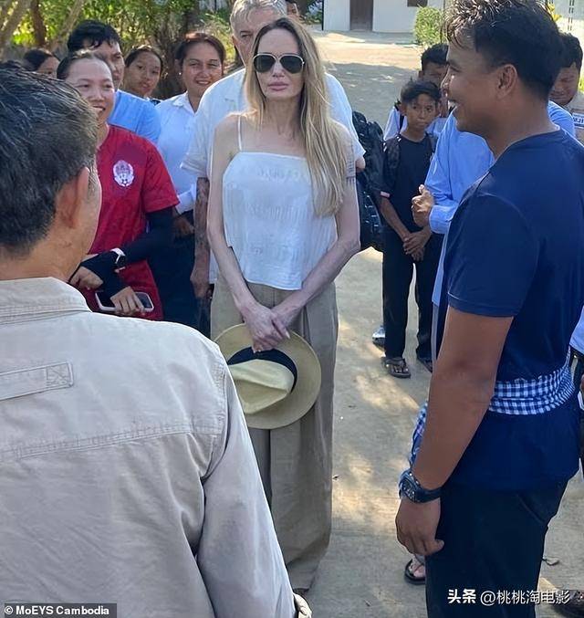 就在四月的第一周,朱莉现身柬埔寨马德望省的萨姆劳特中学。当天的她衣着相当考究,上身是一件质感极佳的象牙白真丝吊带背心,下身搭配卡其色休闲裤,头上还戴着一顶系着宽黑丝带的草帽。